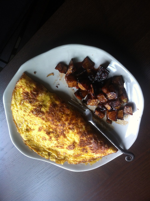 Started off right with an über-local breakfast — omelette i made from chris’ ducks egs, spinach, pdx cheddar, along with sweet potatoes aimee dug up from her garden and broiled in balsamic.